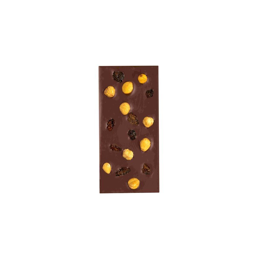 Vyrobená z tých najkvalitnejších kakaových bôbov criollo a trinitario z Južnej Ameriky. Ako jedna z mála čokolád na trhu neobsahuje sójový lecitín. Zvýšený obsah kakaovej sušiny podčiarkuje jej kvalitu a znižuje obsah cukru v tejto lahodnej čokoláde. Chuť je doplnená o výnimočné čerstvo upražené lieskovce z Piemontu a šťavnaté hrozienka.